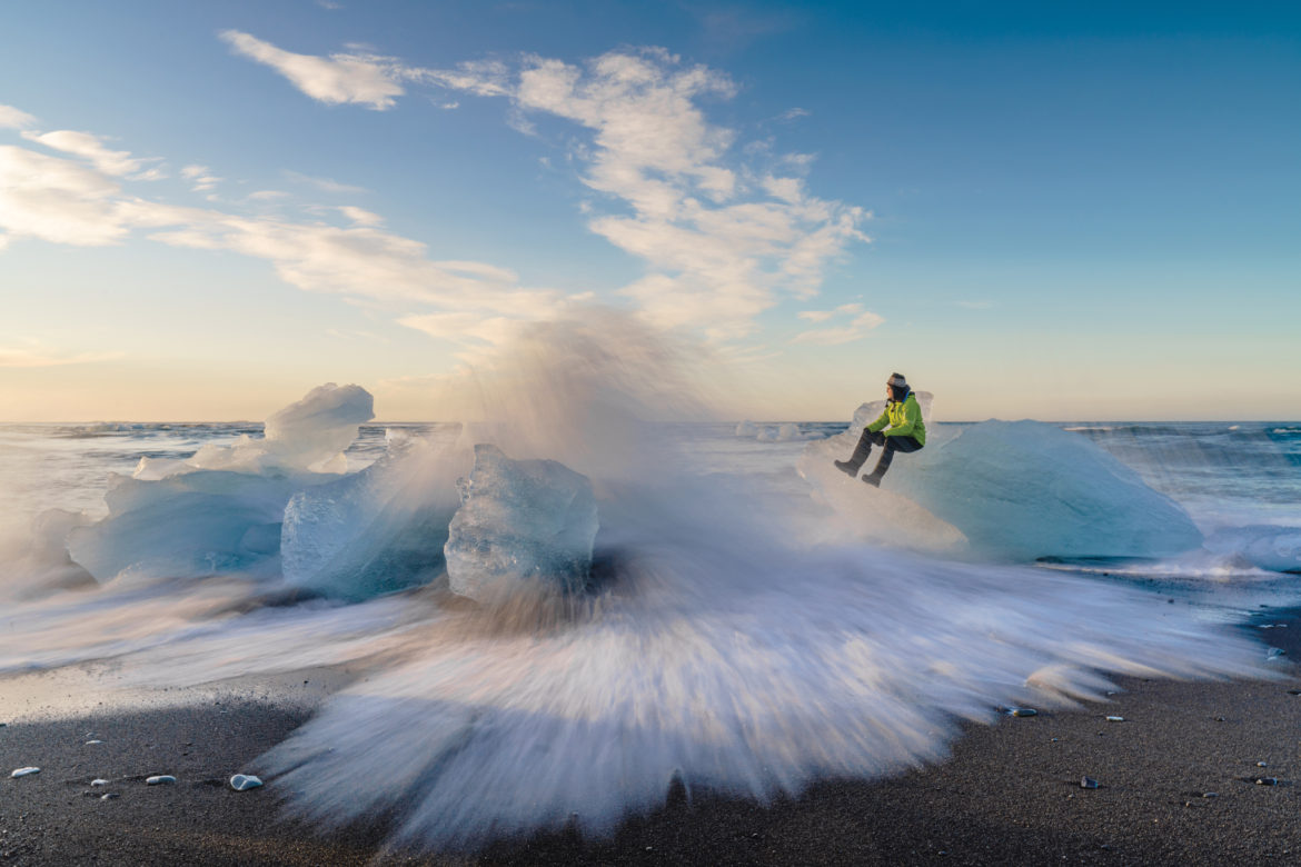 One cannot go to Iceland without photographing ice, and Jökulsárlón is the place to do just that. The glacial river lagoon collects large chunks of ice that have broken off from Breiðamerkurjökull glacier. In the warmer months, the ice often stays in place for hours or days, before breaking apart with a loud and crushing noise before floating out to the sea. Often, large pieces of ice will get caught on the sandy beach on the opposite side of Route 1, giving photographers incredible foreground elements during the beautiful golden light that occurs in the Icelandic Summer.